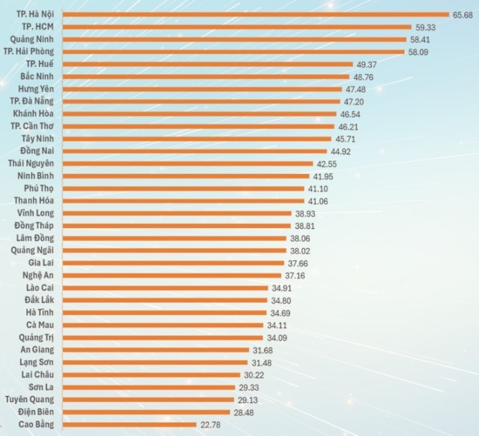 • Hà Nội – dẫn đầu toàn quốc với 65,68 điểm và 18 chỉ số thành phần đứng đầu.