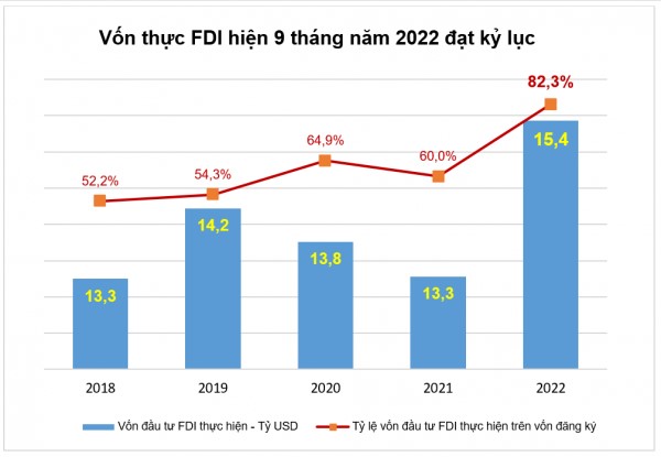 Vốn đầu tư FDI thực hiện tại Việt Nam 9 tháng năm 2022 ước tính đạt 15,43 tỷ USD, tăng 16,3% so với cùng kỳ năm 2021. Đây là số vốn FDI thực hiện cao nhất của 9 tháng trong 5 năm qua. Tỷ lệ vốn FDI thực hiện trên vốn đăng ký so sánh trong giai đoạn 2018-2022 cho thấy xu hướng rất tích cực của đầu tư FDI tại Việt Nam: Tỷ lệ vốn thực hiện trên vốn đăng ký 9 tháng năm 2022 đạt 82,3%, là tỷ lệ đạt cao kỷ lục.